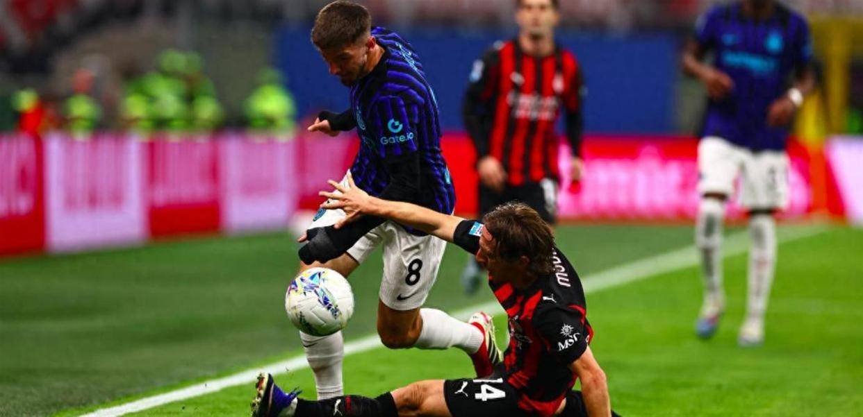 比赛在略显沉闷的氛围中拉开帷幕,双方都显得小心谨慎。开场仅仅3分钟,国际米兰门将索默的一次后场出球失误险些酿成大祸。他的传球被AC米兰前锋普利西奇敏锐地抓住,普利西奇迅速横传至禁区弧顶,老将莫德里奇跟上就是一脚劲射,皮球贴着立柱飞出底线,惊得国米球迷一身冷汗。
